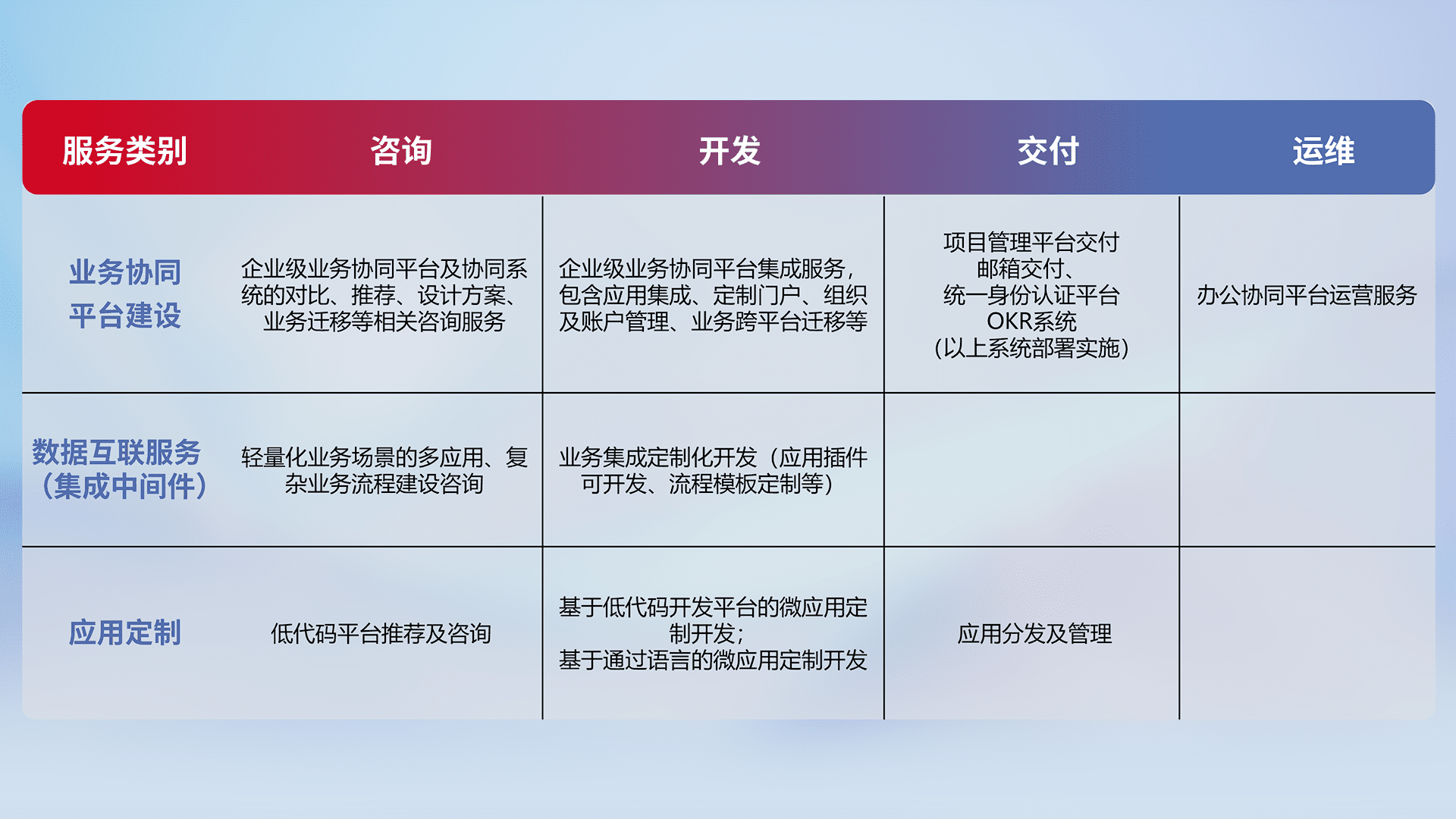 针对钉钉、、企微、、、IDaas等平台级产品提供产品的规划、、方案、、、、交付、、、定制化开发等服务,,实现如统一协同办公、、、、智能客户服务、、、、混合会议管理、、、、智能数据查询、、等业务场景,,,,实现数字化转型。。。